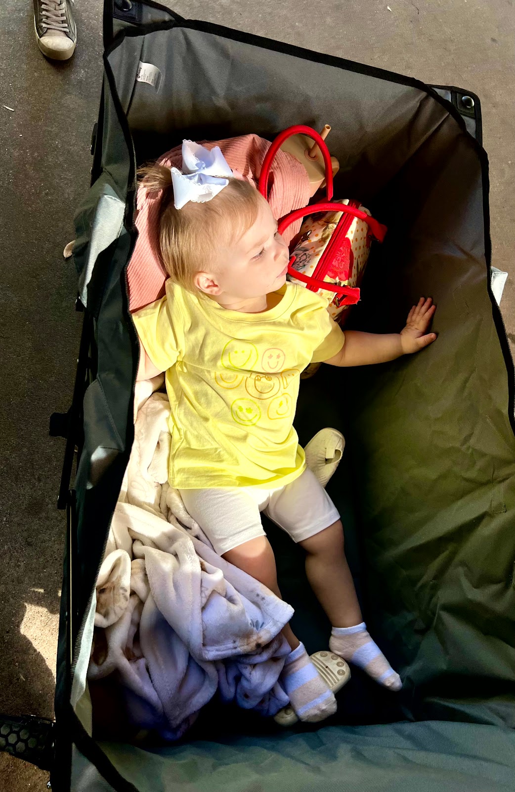 Larry (Gampa) and I (Gamma) gave Samantha (our granddaughter), this buggy for her work.   She does weddings and needed a method of transporting all her supplies from her car to the venues.  Sloane, (our greatgran) decided it must be for her...and refused to get out of it...Lolol